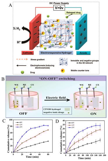 | Electric field responsive | PPy nanoparticles loaded in PLGA, PEG hydrogels, Agarose, calcium alginate, carbomer, chondroitin sulphate, hyaluronic acid, partially hydrolyzed PAM, PDMA, and xanthan gum | Upon the application of an electric field, deswelling or bending takes place, based on the shape and position of the gel relative to the electrodes. | Biocompatibility, minimal invasiveness, controlled release of the cargo depending on the strength or the duration of applied electric field | Drug delivery, creams and suspensions as emulsion stabilizer, in cosmetics as thickener and stabilizer, buccal delivery. | [24,25,26] |
