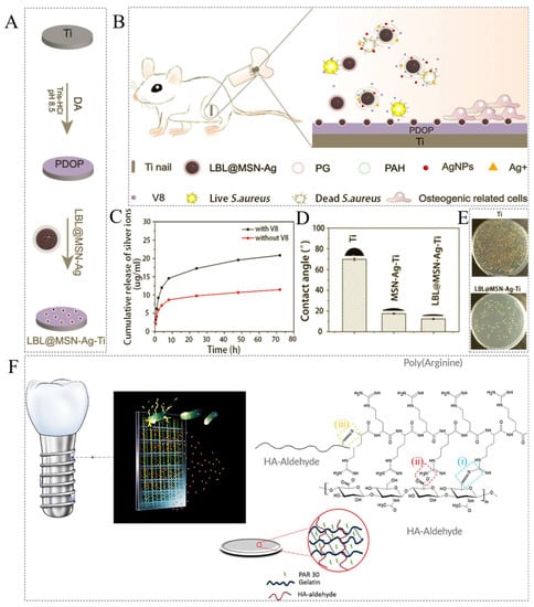 - Ding, Y.; Hao, Y.; Yuan, Z.; Tao, B.; Chen, M.; Lin, C.; Liu, P.; Cai, K. A dual-functional implant with an enzyme-responsive effect for bacterial infection therapy and tissue regeneration. Biomater. Sci. 2020, 8, 1840–1854. [Google Scholar] [CrossRef]