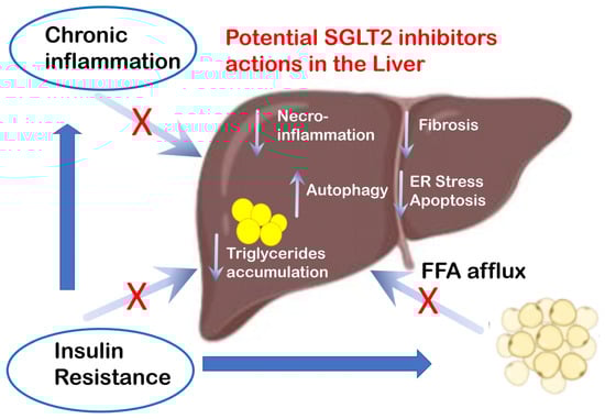 Several studies have shown that the administration of SGLT2 inhibitors has proven efficacy in terms of reducing plasma levels of ALT, body weight [], and blood pressure and improving glycated hemoglobin (HbA1c) [], reducing risks of cardiovascular and renal diseases, all of which are factors that inhibit the progression to NASH []. In addition, by reducing fat mass, SGLT2 inhibitors prevent the release of inflammatory cytokines by adipocytes, thus decreasing the inflammatory effect, which is one of the main causes of NASH progression [].