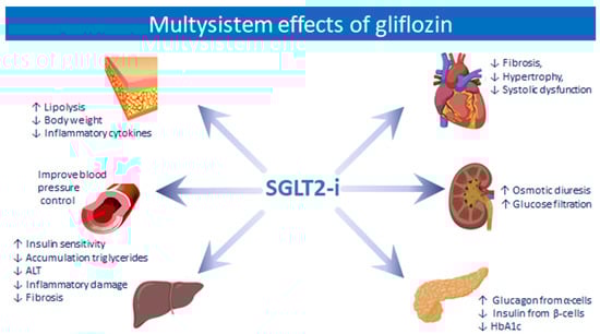 Among all the drugs used in T2DM therapy, one seems to be more promising and shows evident benefits in patients with NAFLD: sodium-glucose cotransporter (SGLT2) inhibitors. In normo-glycaemic conditions and with preserved renal function, the renal filtration threshold of glucose is equal to 180 g/day; when plasma glucose levels exceed this threshold, it is eliminated in the urine together with sodium. There are two types of cotransporters: SGLT1, present both in the intestine and below the Bowman’s capsule in the thick portion of the proximal convoluted tubule, and SGLT2, which instead is present exclusively in the renal tubule. Approximately 97% of the glucose is reabsorbed upstream of the proximal tubule by SGLT2, while the remaining glucose is reabsorbed downstream by SGLT1. In hyperglycaemic states, the kidneys increase their renal resorption capacity up to a maximum of 600 g/day to prevent renal loss of glucose [,]. This effect, mediated by the SGLT cotransporter, not only leads to an increase in the reabsorption of glucose but also of sodium and liquids so that the inhibition of this transporter would not only have beneficial effects on glycaemic control but also in sodium homeostasis and water retention. SGLT2 inhibitors were developed for the management of T2DM, inhibiting the reabsorption of glucose in the kidney and decreasing blood glucose levels. Several recent clinical studies have shown that they can improve liver function in patients with NAFLD as well as in T2DM (Figure 2). Moreover, for this consistent impact on natriuresis and diuresis, they have been proposed for the co-management of T2DM and refractory ascites in cirrhosis []. For these pathophysiological reasons, SGLT2 inhibitors are important, promising therapeutic agents in patients with NAFLD [,].