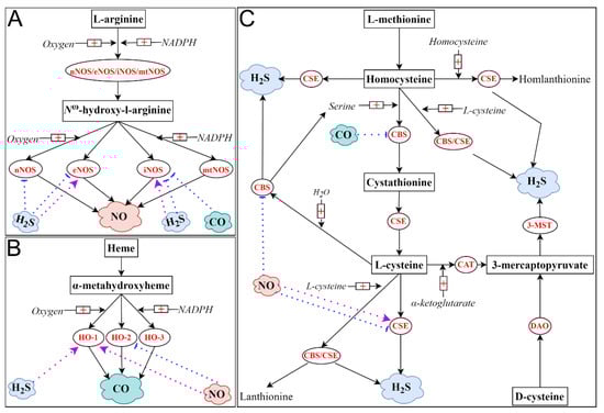 Enzyme-derived endogenous production of NO (A), CO (B) and H2S (C). Endogenous NO is produced from a two-step biological process catalyzed by NOS. L-arginine is hydroxylated to Nω-hydroxy-l-arginine; the latter is further oxidized to L-citrulline and NO. Endogenous CO is generated from the degradation of heme. Firstly, heme is oxidized to α-metahydroxyheme in the presence of oxygen and NADPH. Secondly, α-metahydroxyheme reacts with oxygen, resulting in the biosynthesis of CO. NADHP is also required for this reaction. Relatively, the biosynthesis of H2S is more complex as H2S can be generated from four enzymatic pathways. Briefly, H2S is naturally produced from the desulfydration of L-cysteine or homocysteine catalyzed by CBS, CSE and 3-MST/CAT. Specifically, CBS and CSE are involved in transsulfuration reactions, whereas 3-MST is responsible for L-cysteine catabolism. Recently, the 3-MST/DAO pathway has gained acceptance as the fourth pathway for H2S biosynthesis, using D-cysteine as the substrate. The biosynthesis of every gaseous mediator might be affected by the remaining two gases. Purple arrow: activation; blue arrow: suppression.