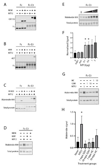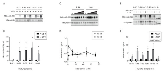 Three thiol detection methods were used: N-ethylmaleimide reaction of thiol groups followed by antibody-mediated detection of alkylation products [23] (Figure 1A); iodoacetamide reaction of thiol groups followed by antibody-mediated detection of alkylation products [24] (Figure 1B); and direct labeling of thiols with maleimide dye [Young KZ, accepted for publication] (Figure 1C). Each of the approaches demonstrated consistent increases in thiol alkylation of Fc-E3 protein after exposure to NTF2 (increased labeling in fourth lane compared to the third). The Fc protein without NOTCH3 sequences did not demonstrate increases in thiol alkylation after NTF2 challenges (in contrast, baseline Fc labeling with maleimide decreased with NTF2); this indicated that the NOTCH3 sequences within test proteins were targets of NTF2. The maleimide dye reactive thiols that were liberated by NTF2 were completely prevented by NEM and IAM (Figure 1D), consistent with maleimide dye reacting with thiol groups on cysteine residues. In a dose escalation of NTF2 with fixed amounts of Fc-E3 target protein, we found concentration-dependent increases in maleimide dye incorporation into Fc-E3 (Figure 1E,F).