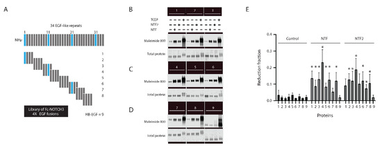 Trans-reduction of the four EGF domain fragments of NOTCH3 by NTF or NTF2. (A) The schematic representation of the thirty-four EGF repeats present in NOTCH3 is shown on top; below we show a map of each purified protein preparation aligned to NOTCH3; fragments 1–8 each contain Fc fused to four EGF domains. HB-EGF (fragment 9; fused to the C-terminus of Fc) is a non-NOTCH3 EGF domain-containing protein used as a negative control. (B–D) Each EGF fragment (200 ng) was treated with either 2 µg NTF, NTF2 or 2.5 mM TCEP and the reduced protein was labeled by maleimide dye followed by detection of available cysteines by gel scanning (upper panel). Protein loading was controlled by Simply Blue staining detected by gel scanning (lower panel). (E) Reduction fraction (ratio of maleimide signal to Simply Blue signal, which was then normalized to the ratio after TCEP treatment) for control, NTF, and NTF2 treatments for each protein is shown in the plot (for NTF treatment, fragments 1, 2, 3, 4, 5, 6, and 8 show differences compared to control, and for NTF2 treatment, fragments 2, 3, 4, 6, 7, and 8 show differences compared to control, * p < 0.05). Reduction fractions after exposure to NTF and NTF2 was compared by subtracting the value achieved by NTF from that by NTF2 (normalized by control/TCEP values) and available in Supplemental Figure S1. Reaction volumes were 5 µL followed by addition of 10 µL labeling mix. All experiments were performed at least four times and included in the final quantified summary.