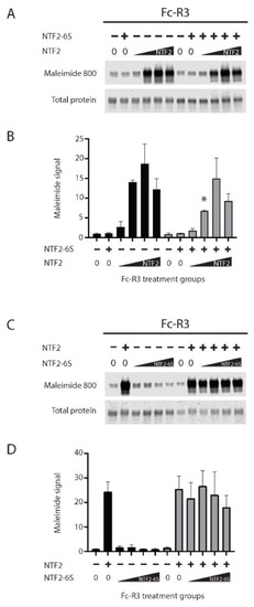 The role of cysteines in NTF2 on trans-reduction of target protein. (A) Fc-R3 (Fc-fusion to the first three EGF-like domains of NOTCH3 with the R90C mutation; 200 ng) was treated with either 0 or 2 µg NTF2-6S (NTF2 peptide in which all cysteines were replaced by serine) and an increasing dose of NTF2 (0, 0.01, 0.1, 1.0, or 2.0 µg) followed by maleimide dye labeling and gel scanning (upper panel). Simply Blue stain was used for detection of total protein loaded (lower panel). (B) Quantification of the trans-reduction of Fc-R3 by 2 µg NTF2-6S and an increasing dose of NTF2. This showed the ability of 2 µg NTF2-6S to partially compete for NTF2 reaction only in one comparison group (0.1 µg NTF2 showed decreased dye reactivity with NTF2-6S compared to without NTF2-6S; * p < 0.05). (C) Fc-R3 was treated with either 0 or 0.5 µg NTF2 and an increasing dose of NTF2-6S (0, 0.01, 0.1, 1, 2 µg) followed by maleimide dye labeling and gel scanning (upper panel). Total protein loading was detected by Simply Blue stain (lower panel). There was no evidence for a consistent ability of NTF2-6S to compete against NTF2. (D) Quantification of trans-reduction of Fc-R3 by 0.5 µg NTF2 with increasing doses of NTF2-6S. Reaction volumes were 5 µL followed by addition of 10 µL labeling mix. All experiments were performed at least three times and included in the final quantified summary.