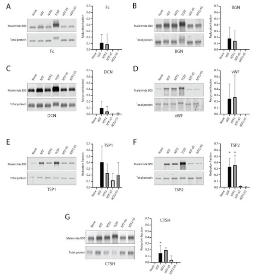 All proteins tested except one (HTRA1) showed increased levels of thiol labeling after reduction with TCEP. Matrix proteins had notable levels of baseline reactivity with maleimide which varied depending on the protein (BGN, DCN, CTSH, and HTRA1 had high levels). After labeling of thiols of proteins challenged with NTF, NTF2, NTF-6S, or NTF2-6S, the untreated baseline (ratio of maleimide labeling to Simply Blue labeling) was subtracted from each sample and then normalized to thiol labeling after TCEP reduction (adjusted reduction fraction shown in the y-axis of graphs in Figure 4). As shown in Figure 4, TSP2 (Figure 4F; with both NTF and NTF2) and CTSH (Figure 4G; with NTF2) showed statistically significant increases in protein reduction compared with control challenges with NTF-6S or NTF2-6S. For HTRA1, thiol labeling was lower than control after TCEP reduction (not displayed in Figure 4). These studies demonstrated selective trans-reduction of vascular proteins by NTF2 and modest differences between sequences targeted by NTF and NTF2.