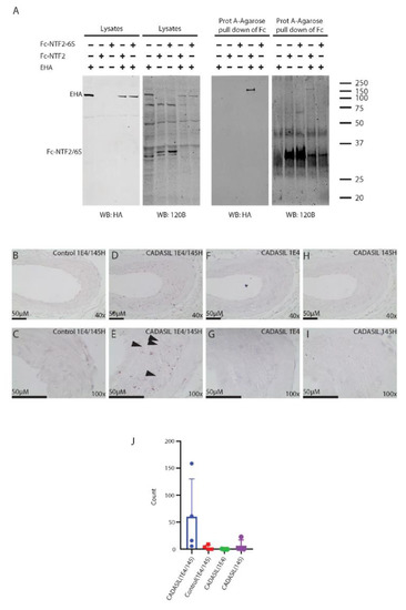 NOTCH3 protein co-precipitation with NTF2 and co-localization in vivo with NTF2. (A) To determine if NTF2 binds to NOTCH3 ectodomain, HEK 293 cells transfected with a combination of plasmids encoding EHA (NOTCH3 EGF-like domains 1–33 with HA tag), Fc-NTF2, and Fc-NTF2-6S, as indicated. Fc-NTF2 and Fc-NTS2-6S were generated by fusing coding sequences for NTF2 or NTF2 in which all cysteines were replaced by serines. Lysates were prepared for immunoblot analysis (left two blots) and then subjected to co-precipitation using Protein A-agarose to pull down Fc protein produced by transfection (Fc-NTF2 and Fc-NTF2-6S). Protein A-agarose pull downs (for Fc-proteins) were analyzed by Western blotting (right two blots marked above as Protein A-Agarose for Fc pull down). HA (Santa Cruz; mouse monoclonal antibody to detect EHA) and 120B (rabbit monoclonal antibody against NTF2 [22] and NTF2-6S) were used on the same blots. Expression of the Fc proteins in lysates was low but could be detected after pull down at 30 kDa (marked as Fc-NTF2/6S on the left). The EHA pull down band is expected to migrate at 150 kDa (marked on the left). PLA was performed on postmortem CADASIL and control brains using a rabbit monoclonal NTF2 antibody (145H [22]) and a mouse NOTCH3 antibody (1E4; [27]). Images of cerebral vessels are shown in the upper row (B,D,F,H) at 100× magnification and in the lower row (C,E,G,I) at 400× magnification. PLA signal was absent in control tissue (B,C) and present mainly in the medial layer of CADASIL tissue (D,E). Arrowheads in (E) are included that show sites of prominent PLA signal in the media of the CADASIL vessel. No signal was detected in CADASIL tissue in the presence of 1E4 alone (F,G) and rare signals were spotted in the presence of 145H (H,I). Scale bars are 50 microns. (J) Quantification of PLA signals that were counted from cerebral arteries from CADASIL and control brain (n = 4 each); control signals were also quantified in samples that used only one antibody from matched vessels (in serial sections of the same brains; see detailed explanation in Supplemental Figure S3).
