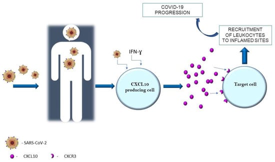 In December 2019, a novel highly pathogenic coronavirus was discovered in patients with infectious respiratory disease in Wuhan, in the Chinese province of Hubei. The disease caused by Severe Acute Respiratory Syndrome Coronavirus-2 (SARS-CoV-2), nowadays known as the Coronavirus Disease 2019 (COVID-19), has spread rapidly around the world, triggering a pandemic []. It has been observed that the SARS-CoV-2 infection can cause a wide spectrum of clinical manifestations []. It is well known that COVID-19 in most cases is asymptomatic or mild with symptoms such as fever, dry cough, headache, muscle and joint pain, loss of smell and taste, and characteristic exhaustion and tiredness [,]. Unfortunately, sometimes SARS-CoV-2 infection may develop into a critical condition or even death in the course of an excess of the immune system. This can lead to serious tissue damage, as well as long-term complications of COVID-19 disease []. The SARS-CoV-2 coronavirus mainly affects the respiratory system of the patient via the angiotensin-converting enzyme 2 (ACE-2) receptors. In the respiratory system, by binding to the cells that build the alveoli of the lungs, it causes various symptoms, from completely non-threatening to respiratory failure requiring intensive care [,]. In the cardiovascular system, SARS-CoV-2 infection leads to complications such as infarction and inflammation of the heart muscle, exacerbation of heart failure, and arrhythmias []. On the other hand, the severe course of COVID-19 could be associated with serious neurological symptoms, including stroke, which indicates the entry of the virus into the central nervous system []. So, as can be seen, the SARS-CoV-2 virus can have an effect on every organ and the infection can lead to multisystem inflammatory syndrome. Although many different factors such as matrix metalloproteinases or vascular endothelial growth factors are involved in the course of immunological processes, undoubtedly one of the main regulatory factors are cytokines [,,]. Cytokines are pleiotropic, which means that they can act on many different cell populations and exert different effects []. Long-term cytokine activity results in excessive levels of cytokines which are known as a “cytokine storm” []. An important group of cytokines are chemokines, which are classified according to their structure. A crucial role of chemokines in the recruitment of white blood cells to sites of inflammation []. For about two years, intensive research has been carried out on chemokines and chemokine receptors, which has resulted in the discovery of new functions and confirmation of their involvement in the development of COVID-19 disease. It has been observed that the expression of chemokines and their receptors can be positively or negatively regulated for their level of transcription by a variety of factors, including the SARS-CoV-2 virus [,,,]. Moreover, it has been identified from several studies that chemokine ligand 10 (CXCL10, IFN-γ-induced protein-10) is a very important factor that regulates many processes in the body, in particular, modulating the course and the intensity of inflammation caused by SARS-CoV-2 (Figure 1) [,,]. In response to SARS-CoV-2 and increased activity of IFN-γ, this chemokine is produced by a wide range of cell types including neutrophils, monocytes, endothelial, or dendritic cells [,]. In turn, CXCL10 is selective ligand for CXCR3, which is mainly expressed on macrophages, T lymphocytes, dendritic cells, natural killer cells, and B cells. The CXCL10-CXCR3 axis has essential roles for the immune system. It has been revealed that normally it regulates immune cell differentiation, activation, and migration []. On the other hand, CXCL10 with CXCR3 have very important roles in selective cells recruitment to inflamed sites and in the intensification of inflammation, and also tissue damage. One of the main functions of CXCL10 is to promote the recruitment of CD8+ and Th1-type CD4+ effector T cells to infected or inflamed tissues. Moreover, it has been proven that CXCL10 promotes the accumulation of CD4+ and CD8+ T cells in infected tissues. Therefore, overactivity of the CXCL10–CXCR3 axis is associated with the development of some diseases. The abnormal activity of the axis has been observed in several autoimmune diseases including rheumatoid arthritis or systemic lupus erythematosus and cancers e.g., skin or brain cancers [,,,]. So, knowing that CXCL10 through CXCR3 is associated with inflammatory diseases, it has been suggested that the CXCL10–CXCR3 axis may be probably involved in development of COVID-19. Therefore, this review focused on the role of CXCL10 in SARS-CoV-2 infection.