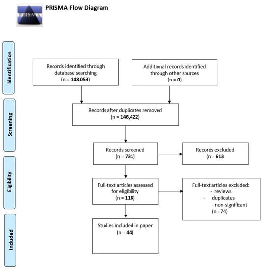 We performed a comprehensive literature search covering the period up to the end of February 2022 using the MEDLINE/PubMed database with the following search strategy: key words “SARS-CoV-2” (148,053 studies). Then we used the key words “SARS-CoV-2 AND chemokines” and a total of 731 papers were found. A search including the key words “SARS-CoV-2 AND CXCL10” produced a total of 118 papers. In the next step, we limited studies to studies in English and we excluded duplicates or all non-significant papers (i.e., papers that did not concern CXCL10). Finally, 44 publications concerning CXCL10 were included in the review. All studies found were published between May 2020 and February 2022. All steps are presented in the PRISMA Flow Diagram (Figure 2) [].