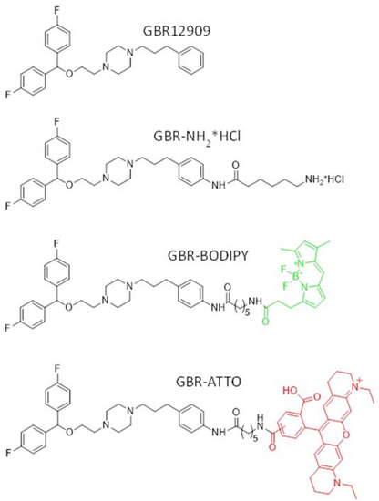Fluorescent analogs of GBR-12909 were synthesized using commercially available BODIPY-C3 acid and ATTO-565-NHS (succinimide ester) by addition to compound GBR-NH2*HCl, as previously described [24] (Figure 1 and Figure S1).