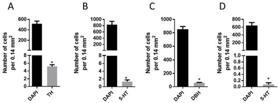 Mean number of all cells labeled with DAPI-stained nuclei in a primary culture of mesencephalon (A,B) and metencephalon (C,D) in mice in randomly selected culture areas of 0.14 mm², as well as the average number of mesencephalic neurons immunopositive for tyrosine hydroxylase (TH) (A) or 5-hydroxytryptamine (5-HT) (B), as well as of metencephalic neurons immunopositive for dopamine-β-hydroxylase (DBH) (C) or 5-HT (D). * p ˂ 0.05.