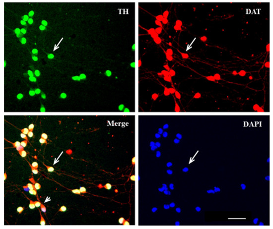 LUHMES cells double-immunostained for tyrosine hydroxylase (TH, green. AlexaFluor 488) and dopamine transporter (DAT, red, AlexaFluor546), with nuclei stained with DAPI (blue). Merge-colocalization of TH, DAT and DAPI (yellow) Arrows indicate cells immunostained for TH and DAT and stained with DAPI; the arrowhead indicates the transition zone of the cell body to the cell process, occupied by DAT. Objective magnification = ×20 (Plan-Neufluar). Bar = 50 µm.