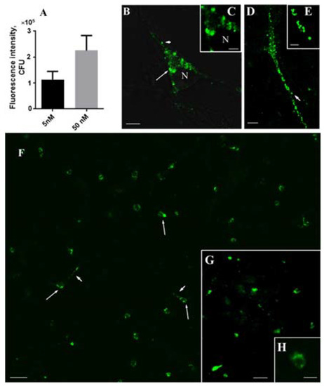 Conventional and confocal fluorescence microscopy of GBR-BP-stained living cells of the primary culture of the mouse embryonic mesencephalon (7th day of cultivation) and living cells of the substantia nigra (vibratome sections) of an adult mouse. (A) Fluorescence intensity of cells of the embryonic mesencephalon when incubated with GBR-BP at a concentration of 5 nM or 50 nM. In all experiments (B–H), GBR-BP was used at a concentration of 50 nM. (B,C) GBR-BP deposition in the neuron cell bodies in rounded vacuoles of various sizes (mesencephalic culture); (D,E) GBR-BP deposition in the neuron processes in small rounded vesicular structures (mesencephalic culture); (F) general view of a primary mesencephalon culture; (G,H) GBR-BP-stained cells in the vibratome sections of adult mouse substantia nigra. Objective magnification = ×64 (B–E); objective magnification = ×10 (F). arrow, cell body; arrowhead, cell processes. Bars = 5 µm for (B,E); 2.5 µm for (C); 50 µm for (F); 20 µm for (G); 10 µm for (H). CFU, cell fluorescence unit; N, nucleus.