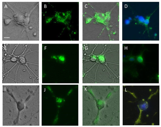 Microphotos of primary cell culture of the mouse mesencephalon (A–D) and metencephalon (E–L) (7th day of cultivation) after the following procedures: (i) phase contrast photography (A,E,I); (ii) incubation with 50 nM GBR-BP and photography of GBR-BP-stained fluorescent cells (B,F,J); (iii) merging the images obtained in “i” and “ii” (C,G,K); (iv) fixation with 4% paraformaldehyde with loss of GBR-BP fluorescence followed by fluorescent immunostaining of mesencephalic cells for tyrosine hydroxylase ((TH); dilution 1:500) (Abcam, ab19353) (D) and metencephalic cells for dopamine-β-hydroxylase ((DBH); dilution 1:500) (Chemicon, ab1542)) (H) or 5-hydroxytryptamine (5-HT; dilution 1:750) (Sigma, S5575) (L) and DAPi staining of neuronal nuclei. Objective × 20 (Plan-Neufluar). Bar = 50 µm.