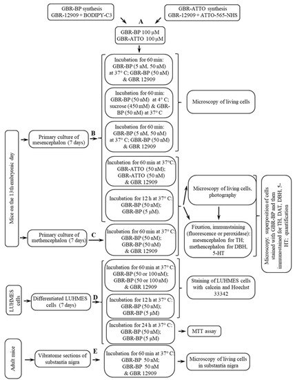 Design of experiments on cells of a primary culture of the mouse embryonic mesencephalon and metencephalon, the immortalized cells of the human mesencephalon (LUHMES) after differentiation, as well as on vibratome sections of the substantia nigra of adult mice: (A) GBR-BP and GBR-ATTO synthesis; (B) staining of mesencephalic living cells with 1-(2-(bis(4-fluorophenyl)methoxy)ethyl)-4-(3-phenylpropyl)piperazine–BODIPY (GBR-BP) and GBR-ATTO; (C) staining of metencephalic living cells with GBR-BP; (D) staining of living LUHMES cells with GBR-BP; (E) staining of nigral living cells with GBR-BP. Fixation of GBR-BP-prestained cells and immunostaining for proteins—markers of dopaminergic, noradrenergic, and serotonergic neurons: tyrosine hydroxylase (TH), dopamine-β hydroxylase (DBH), and 5-hyroxytryptamine (5-HT) (serotonin), respectively.