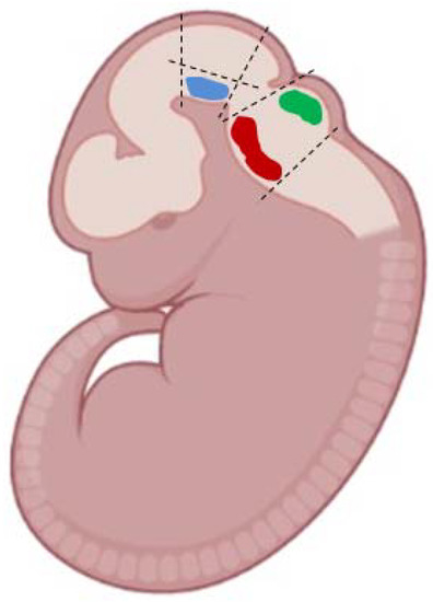 Scheme for obtaining the ventral mesencephalon (blue spot)—the anlage of the substantia nigra, the metencephalon—the anlage of the raphe nucleus (red spot), and the locus coeruleus (green spot) in mice on the 13th embryonic day. Modified from [70,71].