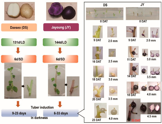 Tuber induction (TI) process from single-node cuttings and phenotypes of each stage. DS (‘Daeseo’) and JY (‘Jayoung’) tissue cultures were kept for 131 days and 144 days, respectively, under long-day conditions (16 h light /8 h dark) in a culture room set to 22 ± 0.5 °C and 110 µmol m−2 s−1 light intensity. Then, plants were transferred to short-day (SD) conditions (8 h light /16 h dark) for 6 days before preparing a single node. Tuber induction was performed in darkness for the indicated days. Tuber diameters are expressed as mm, and JY tubers were cross-sectioned to show anthocyanin accumulation. DAT indicates day after transfer to darkness. Single-node cuttings on induction medium are shown at 0 DAT.