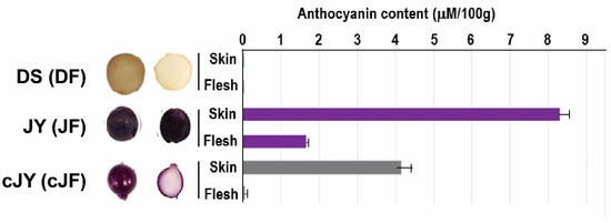 Tuber growth was induced with stem samples of long-day (LD)-grown potato plants transferred to short-day (SD) conditions for 6 days in the dark for 6 to 33 days (Figure 1). DS required a shorter growth period than JY in order to induce tuber growth. In nutrient culture conditions, JY accumulated anthocyanin in every tissue at any phase of growth, with minor variations. On the other hand, DS accumulated significantly less anthocyanin than JY in the same conditions (Figure S1). Moreover, the flesh tissue of JY in tuber induction conditions showed significantly less accumulation of anthocyanin compared with the flesh tissue of JY grown in nutrient culture conditions (Figure 1). Similar to a previous study on other purple-colored cultivars, the skin tissue of JY was measured to have higher anthocyanin contents than in flesh in canonical growth conditions. Interestingly, the flesh tissue of JY in tuber induction conditions had anthocyanin contents as low as in DS samples (Figure 2).