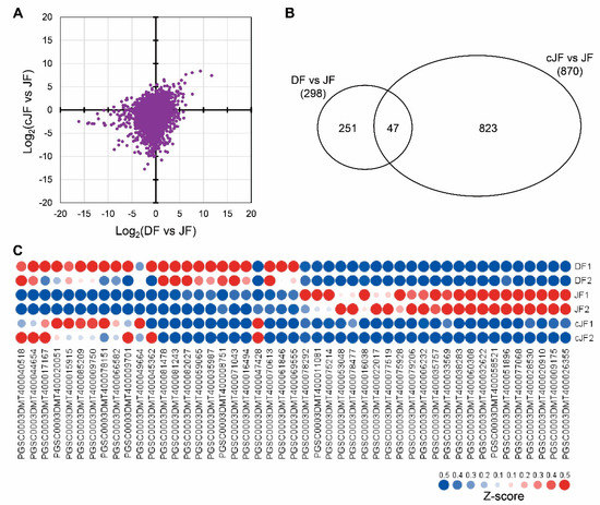 DEG (differentially expressed genes) analysis of DF, JF, and cJF identified 47 genes. (A) Expression patterns in dot plot. The x axis indicates log2 value of TPM (transcripts per million) in DF divided by TPM in JF for each gene, and the y axis indicates log2 value of TPM in cJF divided by TPM in JF for each gene. (B) Venn diagram depicting common and specific DEGs. (C) Heatmap of common DEGs. Z-score for each gene was used. Numbers in sample names indicate biological replicate number.