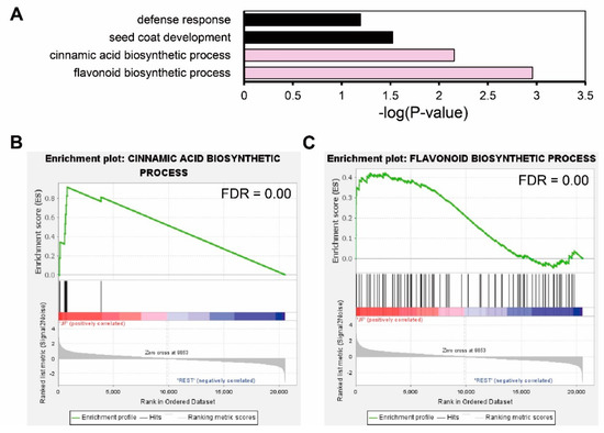 Using 36 JF-specific DEGs, we performed functional annotation with DAVID GO analysis. Four GO terms in biological processes were enriched: defense response (p-value = 0.0015), seed coat development (p-value = 0.00047), cinnamic acid biosynthetic process (p-value = 0.00002), and flavonoid biosynthetic process (p-value = 0.000055). Though we could not detect the direct enrichment of anthocyanin-related GO terms, the flavonoid biosynthetic process and cinnamic acid biosynthetic process which are precursor biosynthetic processes of anthocyanin, were enriched (Figure 4A). We further verified the enrichment of these GO terms by gene set enrichment analysis (GSEA) in the whole transcriptome, comparing JF with DF or cJF. Genes annotated in the cinnamic acid biosynthetic process (FDR = 0.00) and flavonoid biosynthetic process (FDR = 0.00) were significantly enriched and JF-specifically up-regulated (Figure 4B,C), as well as seed coat development genes (FDR = 0.00), but not defense-response-related genes (FDR = 0.07) (Figure S2). These data indicate flavonoid biosynthetic or cinnamic acid biosynthetic genes are JF-specifically up-regulated, which positively correlates with JF-specific anthocyanin accumulation.