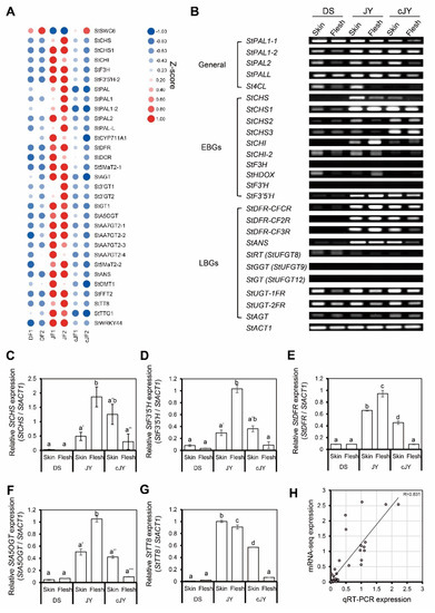 Anthocyanin-related genes were positively correlated with JF. (A) Heatmap of anthocyanin-related genes from mRNA-seq. Z-scores for each gene were used. Numbers in sample names indicate biological replicate number. (B) RT-PCR of anthocyanin biosynthetic genes. General indicates general pathway genes in flavonoid biosynthetic pathway, EBG indicates early biosynthetic genes, and LBG indicates late biosynthetic genes. StACT1 was used as an internal control. (C–G) qRT-PCR of anthocyanin-related genes. Relative expression levels of each gene were determined by 2−ΔΔCT method. Letters represent significant differences based on one-way ANOVA and Tukey’s test (p < 0.05). Two biological replicates were analyzed. (C) Relative expression level of StCHS. (D) Relative expression level of StF3′5′H. (E) Relative expression level of StDFR. (F) Relative expression level of StA5OGT. (G) Relative expression level of StTT8. (H) Linear regression analysis between qRT-PCR expression and mRNA-seq data. Relative expression levels of each gene were determined by 2−ΔΔCT method, as indicated in the x axis, while the TMM-normalized TPM of target genes divided by that of StACT1 is indicated in the y axis.