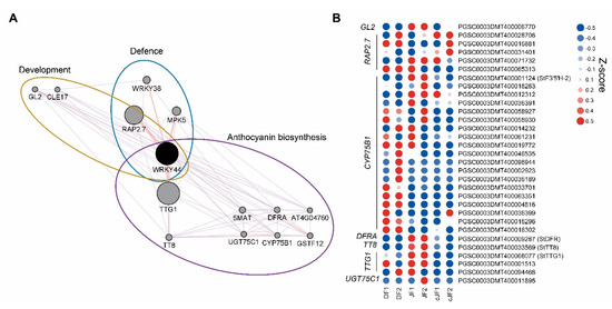 DEG analysis indicated that a portion of transcription factors regulating anthocyanin accumulation were JY-specifically up-regulated, such as MYB domain-containing protein 3 (MYB3), transcription factor TT8 (TT8), and WRKY transcription factor 44 (WRKY44), which were positively correlated with our phenotype (Figure 3C; Table S2). To identify the putative regulator of anthocyanin accumulation in the flesh tissue of JY, we performed network analysis and found WRKY44 as a putative central regulator of our phenotype (Figure 6A). Moreover, WRKY44 regulated many anthocyanin biosynthesis-related genes as a putative complex with TRANSPARENT TESTA GLABRA 1 (TTG1) and TT8. Anthocyanin biosynthetic genes in the WRKY44 network were more highly expressed in JF than in DF or cJF, such as flavonoid-3′,5′-hydrolase 2 (St3′5′H-2) and dihydroflavonol 4-reductase A (StDFRA), as well as TTG1 and TT8, which were known to positively regulate anthocyanin accumulation (Figure 6B). Taken together, our results suggest a novel WRKY44-bHLH-WD40 module in the regulation of anthocyanin biosynthesis.