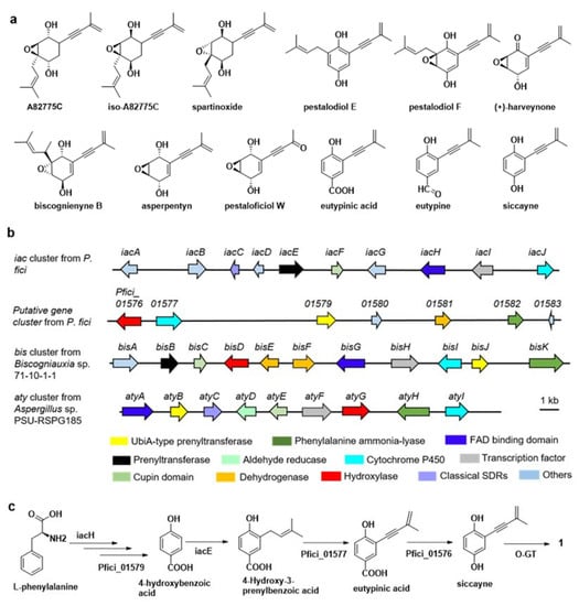 - Lv, J.M.; Gao, Y.H.; Zhao, H.; Awakawa, T.; Liu, L.; Chen, G.D.; Yao, X.S.; Hu, D.; Abe, I.; Gao, H. Biosynthesis of biscognienyne B involving a cytochrome P450-dependent alkynylation. Angew. Chem. Int. Ed. Engl. 2020, 59, 13531–13536. [Google Scholar] [CrossRef]