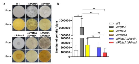 2.5. Assessment of Conidia Development in the Mutant Strains