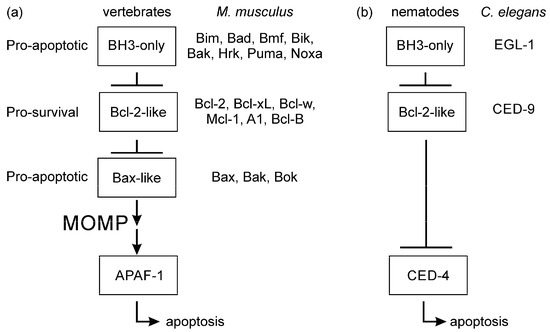 Simplified apoptosis schemes for vertebrates and nematodes. (a) The 17 members of the Bcl-2 family of M. musculus are indicated in the three classes. (b) The Ecdysozoan C. elegans apoptosis scheme is much simplified compared to that in mammals bearing a single Bcl-2 protein CED-9 and BH3-only protein EGl-1. The result of either signalling pathway is the activation of caspases that dismantle the cell.