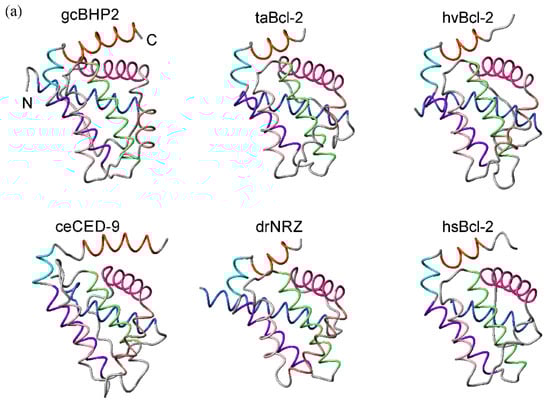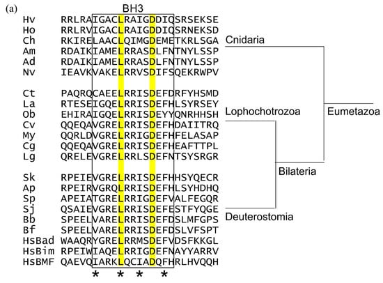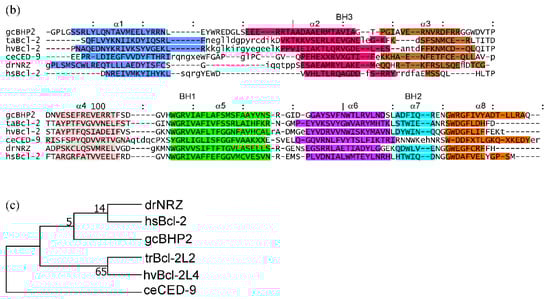 Bcl-2 fold and BH regions were confirmed using the NCBI Conserved Domain Database (CDD) https://www.ncbi.nlm.nih.gov/Structure/cdd/wrpsb.cgi [36] accessed on 29 July 2019.