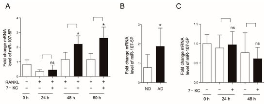 Our findings demonstrated that 7-KC increases OC differentiation by inducing miR-107-5p, and the tibiae of mice fed with AD exhibited upregulation of miR-107-5p. Increased expression levels of miR-107-5p were detected 48 h after 7-KC exposure in RANKL-stimulated OCs in vitro. Overexpression of miR-107-5p increased the number and surface area of OCs and increased bone resorption, as determined by evaluating the total pit area per TRAP-positive OC, suggesting that miR-107-5p may participate in not only differentiation but also the activity of OCs upon 7-KC stimulation. Conversely, knock-down of endogenous miR-107-5p induced by 7-KC decreased the area and number of OCs. Consistent with our results, upregulation of miR-107 has been found in ovariectomized (OVX) rats, whereas teriparatide treatment had the opposite effect [], suggesting that miR-107 plays a positive role in bone loss. Furthermore, downregulation of miR-107 has been reported in the livers of leptin-deficient and diet-induced obese mice, resulting in insulin resistance []. Our previous findings demonstrated that common factors that induce bone loss in mice can also induce insulin resistance [,,,], suggesting that miR-107 plays a role in the development of metabolic disease, which could indirectly affect bone density.