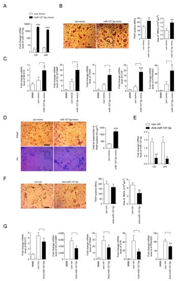The expression level of miR-107-5p regulates osteoclast (OC) differentiation. BMMs were prepared, incubated with M-CSF (30 ng/mL) and RANKL (40 ng/mL) for 48 h, and transfected with 30 nM of miR-107-5p mimic or con mimic (A–D). BMMs were prepared, incubated with M-CSF (30 ng/mL), RANKL (40 ng/mL), and 7-KC (7 μM) for 48 h, and transfected with 30 nM of anti-miR-107-5p or con inh (E–G). After the indicated time points, total RNA was analyzed by qPCR to quantify the expression of miR-107-5p. The expression levels of BMM (A,E) were set to 1. Cells were incubated for 17 h and fixed to analyze tartrate-resistant acid phosphatase (TRAP)-positive OCs (B,F) and the expression of TRAP, nuclear factor of activated T cells 1 (NFAT2), calcitonin receptor (CTR), ATP6v0d2, and dendrocyte expressed seven transmembrane protein (DC-STAMP) were quantified by qPCR (C,G). More than 100 TRAP-positive multinucleated cells (MNCs) in each culture were randomly selected. The area (bold line) of the formed OCs was then measured. Representative photos of OCs. Scale bar; 200 μm (B,F). Mature OCs were loaded on whole dentine and transfected with miR-107-5p mimic or con mimic for another 5 d in the presence of M-CSF and RANKL. After TRAP staining, the cells were removed, and the slices were stained with toluidine blue. Representative photos of TRAP-positive OCs and resorption pits are shown (scale bar: 50 μm). The total pit area/number of TRAP-positive OCs was calculated (D). (A-G; n = 3 each group). * p < 0.05; ** p < 0.01; *** p < 0.001 compared with each corresponding control. Similar results were obtained in three independent experiments.