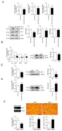 Identification of target for 7-KC-induced miR-107-5p in OCs. (A,D) BMMs were prepared, incubated with M-CSF (30 ng/mL) and RANKL (40 ng/mL) for 48 h, and transfected with 30 nM of miR-107-5p mimic or con mimic (A). BMMs were incubated with M-CSF, RANKL, and 7-KC (7 μM) for 48 h and transfected with 30 nM of anti-miR-107-5p or con inh. (D). Cells were incubated for 17 h and total RNA was analyzed by qPCR to quantify the expression of MAP kinase phosphatase 1 (MKP1), Src homology region 2 domain containing phosphatase-1 (SHP1), and phosphatase and tensin homolog deleted on chromosome 10 (PTEN). The expression levels with con mimic treatment (A) or con inh treatment (D) were set to 1. Cell lysates were subjected to Western blot analysis with antibodies against MKP1, SHP1, and PTEN. Antibodies against β-actin were used for normalization (n = 4). (B) BMMs were incubated with M-CSF, RANKL, and 7-KC. After the indicated time points, total RNA was analyzed by qPCR to quantify the expression of MKP1. After 65 h, cell lysates were subjected to Western blot analysis with anti-MKP1 Ab (n = 3). (C) The total RNA and tissue lysates of tibiae from AD- or ND-fed mice were analyzed by qPCR to quantify the expression of MKP1 and were subjected to Western blot analysis with antibodies against MKP1 (AD, n = 8; ND, n = 8). (E) BMMs were incubated with M-CSF, RANKL, and 7-KC for 48 h, and transfected with 30 nM of scRNA or si-MKP1 with 7-KC in the presence of M-CSF and RANKL. The cells were incubated for 17 h and analyzed to measure TRAP-positive MNCs. Representative photos of TRAP-positive OCs are shown (scale bar: 200 μm). The silencing of MKP1 by siRNA was confirmed by RT-PCR and qPCR (n = 3). * p < 0.05; ** p < 0.01; *** p < 0.001 compared with each corresponding control; ns, not significant. Similar results were obtained from three independent experiments.