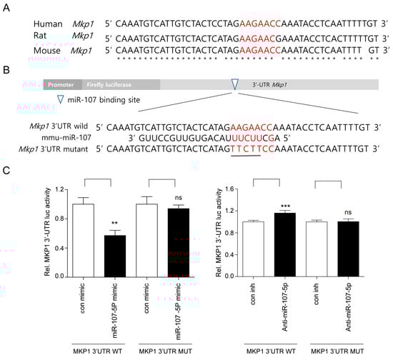 MiR-107-5p specifically targets MKP1 by binding to the 3′-untranslated region (UTR) of MKP1. (A) The target site of miR-107-5p in 3′-UTR of MKP1 is conserved in humans and rodents (indicated with asterisks). (B) The 3′-UTR mutants of MKP1 are identical to the mouse 3′-UTR wild type (WT) of MKP1 except that it contains five single base substitutions (underlined in the figure) to disrupt pairing with mature miR-miR-107-5p (mmu-miR-107-5p). (C) The mouse 3′-UTR WT of MKP1 containing miR-107-5p binding sites or its mutated counterpart were cloned into a luciferase reporter vector and transfected into RAW264.7 cells with miR-107-5p mimic or anti-miR-107-5p with each corresponding control (n = 6). Luciferase assays were performed using a dual-luciferase reporter assay system. ** p < 0.01; *** p < 0.001 compared to its corresponding control; ns, not significant. Similar results were obtained in three independent experiments.