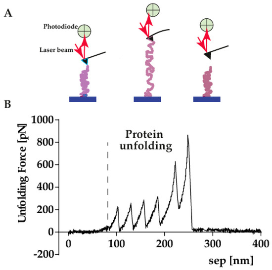 Single-molecule force spectroscopy (AFM-SMFS) is a procedure that studies the mechanical properties of single molecules. It is a terrific tool for understanding protein–protein interactions, protein folding kinetics, and protein unfolding pathways [34]. In this case, the AFM cantilever is above the sample which contain the studied proteins immersed in a buffer. The test is initiated by getting together the cantilever and the sample (protein). When the protein and the AFM tip are in contact, the AFM tip starts moving up away from the surface, pulling on the adsorbed protein. The pulling force that is exerted by the protein on the cantilever is determined by Hooke’s law through the deflection of itself. In a typical experiment, the protein of interest would give a characteristic saw-tooth pattern (Figure 1) where each “rip” corresponds to the unfolding of one of the domains in the polyprotein. The magnitude of force generated with the AFM is sufficient to unfold single proteins and nucleic acid structures. Data are usually analyzed using the worm-like chain model which approximates the molecular extension of a semiflexible chain (like a protein). By fitting each peak in the force–extension curve (Figure 1), data such as contour length and persistence length can be deduced. The contour length of a polymer chain is the physical maximum extension that the latter can achieve. On the other hand, persistence length is a basic mechanical property that quantifies a polymer’s stiffness.