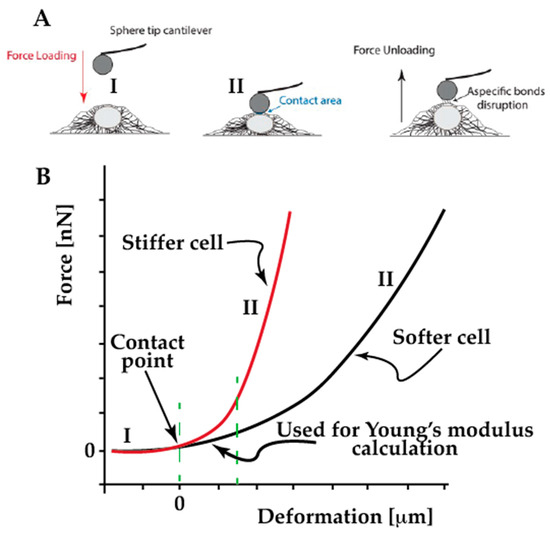 (A) Schematic representation of the AFM single cell force spectroscopy experiment. The AFM cantilever is lowered until it touches the cell, then the pulling force is recorded during loading and unloading. (B) Force–deformation curve during cell loading cycle, the cell (I-red) is stiffer than cell (II-black).