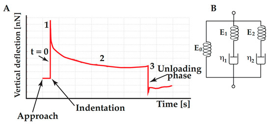 The AFM tip moves toward the cell surface with a speed of 1 μm/s (zone 1 in Figure 3A). The position where the force sharply increased characterizes the contact point between the tip and the cell membrane. After that, the cantilever base position is kept constant for a fixed time, while the cantilever’s force varies, and it is recorded with time (zone 2 in Figure 3A). Figure 3A shows that the loading force decays with time and this behavior is due to the cell viscoelasticity. After the loading time, the AFM tip is withdrawn (zone 3 in Figure 3A). Usually, a dwell period of 60s is used to reduce drift. The curves are normalized by setting the maximum force value to one, meaning all the relaxation data fell in the zero (minimum of the baseline) to one normalized force range. Force data recorded during the dwell time (relaxation phase) are then divided by the tip-cell contact area to get a stress data [48]. Experimental data might be fitted with a double-exponential Equation (2), corresponding to a Generalized Maxwell model with one spring in parallel with two Maxwell elements (Figure 3B). This model is usually chosen over single- and tri-exponential equations because the first does not well describe the first part of the relaxation curve, whereas the latter does not significantly enhance the quality of fitting.