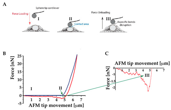 Introduction to the AFM force spectroscopy work for assessing adhesion behavior. (A) experimental setup of AFM force spectroscopy performed on the cell using a sphere tip; (B) sketch of the components of a F-D curve; (C) enlarged plot of the F-D retract part of the curve providing the adhesion data.