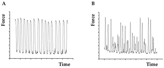 Cell beating characteristics which are of particular interest for studying ACM disease can also be measured using AFM. Here, the cells are gently touched by the cantilever tip (ideally a spherical tip) using, for example, 2 nN of force. The cantilever tip could be maintained in position for a minute interval while deflection data are collected. Deflection data can be transformed to force multiplying by the cantilever spring constant. The resulting data can provide force beating, frequency, duration (peaks distance), and full width at half maximum (FWHM) of each beat (Figure 5). One example of this technique in the literature is the work reported by Pena et al. [51] in which they evaluated the force beating of primary cardiomyocytes cultured in 3D hydrogels. They found that cells cultured on carbon nanotube-functionalized hydrogel had a more rhythmic beating with a stronger force.