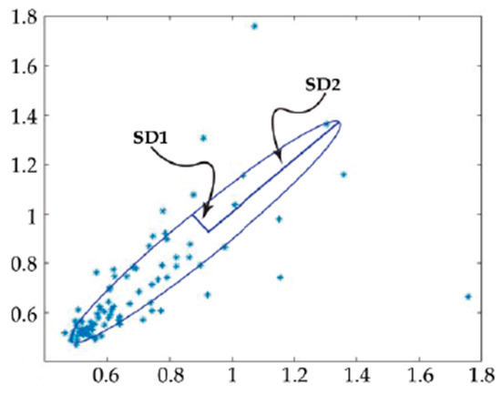 Beating rate variability (BRV) could also be evaluated using the Poincaré plot (Figure 6). The Poincaré plot is a technique suggested by Tulppo et al. [52] for studying heart rate signals. It is a scatter graph of the peak’s interval plotted against the preceding peaks interval. The first peaks interval [53] denotes the x-coordinate, and the second interval [53] denotes y-coordinate. The quantitative analysis of the data is done by fitting an ellipse to the plot with its center corresponding with the centroid of the ellipse. The point where both ellipse axes meet relates to the total mean of the intervals. The length of minor and major axis of the ellipse are 2SD1, 2SD2, where SD1, SD2 are the dispersion perpendicular to the line of identity (minor axis) and along the line of identity (major axis), respectively, as previously described [52]. SD1 is the standard deviation of the instantaneous (short term) beat-to-beat variability while SD2 is the standard deviation of the long-term interval variability. Another index derived from this plot is the axes ratio R = SD1/SD2, measuring the balance between long- and short-term beating variability.