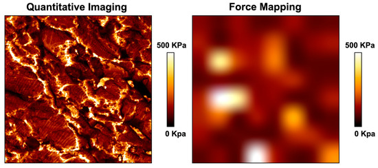 An advantage of force spectroscopy is that the analysis can be relatively fast when compared with quantitate imaging scanning. For example, 50 indentations around a heart tissue can be measured in ~30 min with high quality force curves (by using a microscope in combination with the AFM it is possible to control where the cantilever tip will land thus avoiding tissue irregularities and increasing the quality of the force curves). One of the best probes for tissue analysis with force spectroscopy is the Bruker MLCT. However, it is important to remember that the probe tip is in the nanometer range, and therefore the measurements obtained by force spectroscopy will be only of a nanometer indentation. Several authors have tried to increase the area of analysis using larger spherical probes (10 to 15 µm), however the large spheres can introduce noise vibration during the analysis which affect the quality of the force curves; in addition, a cantilever with a large spherical probe does not solve the fact that only a non-representative tissue area is indented, and so more people are moving to use force mapping. With force mapping, a drip can be used to set several indentations in a determined tissue area (e.g., 64 indentations in a 100 × 100 µm area). The problem with force mapping is that (i) it is difficult to control where probe will land (e.g., irregular tissue) and so, several force curves may need to be discarded, (ii) the force map generated has a very low-quality resolution, (iii) although high resolution stiffness maps can be obtained with force spectroscopy, it will take several hours for the analysis to be performed. An alternative to overcome these limitations is to use fast tissue scanning techniques, such as JPK quantitative imaging and Bruker fast scan. In the JPK quantitative imaging (QI) a whole force curve is measured at every pixel of the selected sample region, generating more than 60,000 force curves per scan and thus providing a high-resolution stiffness mapping of the sample when compared with force mapping (Figure 7).