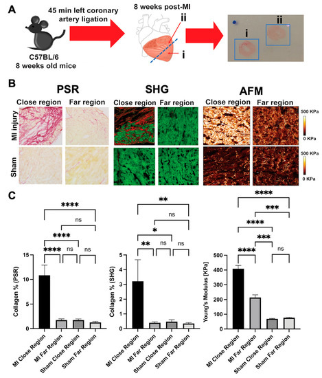 Comparison between Picrosirius Red staining (PSR), SHG, and AFM as techniques to detect fibrosis. (A) representative diagram of the sample collection: Eight weeks post-MI, hearts were harvested, cut in two halves, and cryogenically sectioned. Two sections on the hearts were analyzed. (i) One section was located close to the MI region (close region) and (ii) one section was located in the far MI region (far region). (B) Representative images of the hearts analyzed by Picrosirius Red staining, SHG and AFM techniques. (C) Quantification of collagen by Picrosirius Red staining and SHG and quantification of tissue stiffness by AFM: no significant differences in collagen deposition were observed between the MI far region and the sham (close and far regions); however, significant differences on tissue stiffness (Young’s modulus), analyzed by AFM, were observed between the MI far region and the sham (close and far regions). PSR: MI close region vs. MI far region **** p < 0.0001; MI close region vs. sham close region **** p < 0.0001; MI close region vs. sham far region **** p < 0.0001. ns: non-significant. SHG: MI close region vs. MI far region ** p: 0.0096; MI close region vs. sham close region * p: 0.0126; MI close region vs. sham far region ** p: 0.0082. AFM: MI close region vs. MI far region **** p < 0.0001; MI close region vs. sham close region **** p < 0.0001; MI close region vs. sham far region **** p < 0.0001; MI far region vs. sham close region *** p: 0.0005; MI far region vs. sham far region *** p: 0.0008.