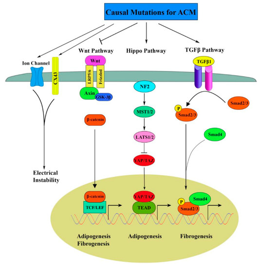 As shown in Figure 10, the molecular pathogenical signaling pathways attributed to the development of the ACM phenotype inlcude: Hippo pathway activation and Wnt inhibition which enhanced adipogenesis, and the canonical TGFβ pathway which contributes to increased fibrosis in ACM through activation of SMADs and JNK. In addition, mutations in desmosome genes also destabilize the intercalated disks, causing dysfunction of ion channels with consequent electrical instability [88].