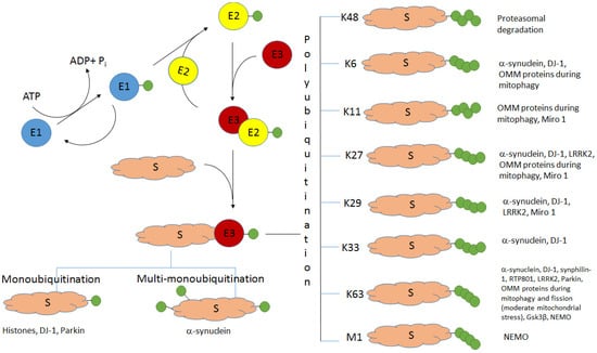 The scheme of ubiquitination and the role of different types of ubiquitination in PD. S—protein substrate, E1—ubiquitin-activating enzyme, E2—ubiquitin-conjugating enzyme, E3—ubiquitin ligase. Ubiquitin molecules are shown as green circles. Adapted from [].