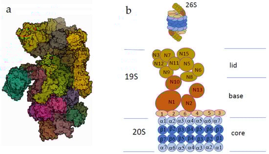 The human 26S proteasome. (a) Electron microscopy (PDB DOI: 10.2210/pdb5LN3/pdbEM Map EMD-4089: EMDB EMDataResource; deposited: 3 August 2016; released: 22 March 2017; deposition authors: Schweitzer, A., Beck, F., Sakata, E., Unverdorben, P. (2017) Mol Cell Proteomics 16: 840–854). (b) The scheme of the proteasome structure. One or two regulatory particles (the sedimentation coefficient 19S) may be attached to the core particle (the sedimentation coefficient 20S). The core particle consists of four rings, each of which contains seven protein subunits. The outer rings consist of alpha subunits promoting substrate insertion into the inner cavity, formed by beta subunits possessing proteolytic activity. The regulatory particle of the proteasome consists of two complexes: the lid and the base. The Rpn subunits without ATPase activity (regulatory particle non-ATPase), marked as N, form the lid. The base consists of two types of subunits. Rpt subunits of the AAA superfamily (regulatory particle triple-A ATPase) are marked as small orange ovals (Rpt1–Rpt6). Rpn subunits (marked as N) do not possess ATPase activity. The subunits N1, N10, and N13 are responsible for the recognition of the ubiquitinated substrates.