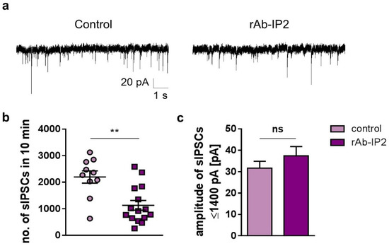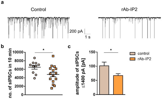 2.1. GABAA Receptor Autoantibodies (rAb-IP2) Reduce Inhibitory Postsynaptic Signaling in Hippocampal CA1 Pyramidal Cells