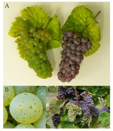 The first mention of the white grapevine variety ‘Riesling Weiss’ dates back to a winery invoice from the Counts of Katzenelnbogen in Rüsselsheim, Germany, in the year 1435 [18]. As a direct descendant of ‘Heunisch Weiss’ and probably a seedling of ‘Savagnin Blanc’ and Vitis sylvestris [19], it is generally assumed that the cradle of ‘Riesling’ lies in the Rhine Valley between Karlsruhe and Worms in Germany [20]. With more than 20,000 hectares of area under cultivation (https://www.vivc.de/ accessed on: 28 February 2022), ‘Riesling Weiss’ is the most planted grapevine variety in Germany and is furthermore world-famous for fresh and fruity wines high in acidity. On the other hand, nothing is known about the origin of the red-berried variant ‘Riesling Rot’, but it can be assumed that it was already planted in mixed plots of the late Middle Ages. Presumably, it was a rare cultivar variant before the phylloxera crisis, so after the switch to varietal vineyards, ‘Riesling Rot’ disappeared completely from cultivation for unknown reasons. Similar to many other varieties without a practically relevant area under cultivation, ‘Riesling Rot’ survived in German grapevine repositories where clone selection began in Geisenheim, Germany in 1991. Since 2002, increased cultivation started and Germany-wide classification has meanwhile been achieved. Ampelographically, ‘Riesling Rot’ can only be distinguished from ‘Riesling Weiss’ by the red berry color (Figure 1). In contrast to most color mutants of other grape varieties, however, the color is not completely stable, so occasionally white grapes can be found on a red vine (Figure 1C). Since this phenomenon could be observed multiple times by winegrowers, but never the mutation from white to red, it was suggested that ‘Riesling Rot’ represents the original form and ‘Riesling Weiss’ may have arisen from it. ‘Riesling Rot’ was titled as the true, long-forgotten ancestor of the famous ‘Riesling Weiss’, raising public interest and supporting commercialization tremendously. However, the hypothesis could never be proven, and based on the scientific knowledge about color mutants of grapevine, the assumption seems implausible.