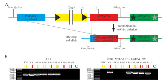 Several mechanisms of homologous recombination have been described for plant somatic tissue, two of which are considered particularly important. In addition to the synthesis-dependent strand annealing mechanism (SDSA), which is one of the conservative mechanisms (no sequence information is lost), the non-conservative (sequence information is lost) single-strand annealing mechanism (SSA) plays an important role [33,34]. In the first step after a DSB, the 5′ ends are resected leading to two free 3′ overhangs. If homologous sequences are now available within both free 3′ ends, hybridization can occur. Gaps in the DNA backbone are closed and the overhanging 3′ ends are removed. The complete sequences between the homologous areas as well as one of the two sequence repetitions are excised. SSA plays a superior role in genomic regions with sequence repeats that are in close proximity [35], but it has also been shown that deletion by SSA can take place despite larger distances between the repeats [36]. An example of this is putatively the already described MybA1b allele and the VvmybA3/1RR allele of ‘Riesling Rot’ described in this study since the SSR marker analysis and the BAC clone sequencing of the mutated haplophase revealed the loss of the complete genomic region between VvmybA1 and VvmybA3. A DSB probably occurred in the area in between, possibly also in Gret1, which in this case led to homologous recombination of VvmybA1 and VvmybA3 through SSA and resulted in the loss of approximately 69 kbp of sequence information. Furthermore, since the mutation could be detected in 16 further independent ‘Riesling Rot’ accessions across Germany, a single mutational event must be assumed.