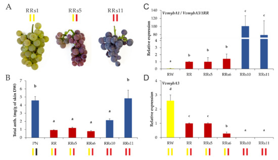 Total anthocyanin content and relative gene expression of VvmybA1/VvmybA3/1RR and VvmybA3 of ‘Riesling Weiss’, ‘Riesling Rot’, and the self-cross line RRs in ripe berry skins. (A) Ripe bunches of the genotypes RRs1, RRs5, and RRs11 with differing haplotype constitutions at the berry color locus. (B) Total anthocyanin content in ripe berries. The classical red wine cultivar ‘Pinot Noir’ with dark blue berries is used as a reference. Data represent the mean values of three independent replicates; error bars represent standard deviation. Relative gene expression of VvmybA1/VvmybA3/1RR (C) and VvmybA3 (D). Data represent the mean values of three independent replicates with normalization to the expression of RR (RW and RR) and RRs5 (RRs line); error bars represent standard errors. Colored bars represent the haplotype constitution at the berry color locus (yellow = white allele, red = red allele, black = wild type blue/black allele of typical red wine cultivars with functional VvmybA1 and VvmybA2). Different letters indicate statistically significant differences (p-value < 0.05). PN = ‘Pinot Noir’; RR = ‘Riesling Rot’; DW = dry weight.