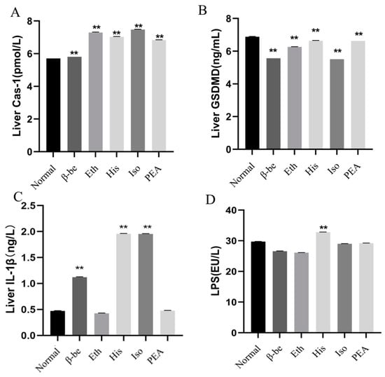 The effects of His, PEA, β-be, and Iso on the pyroptosis pathway and LPS of the gut. ** p < 0.01. (A) Liver Cas-1. (B) Liver GSDMD. (C) Liver IL-1β. (D) Gut LPS.