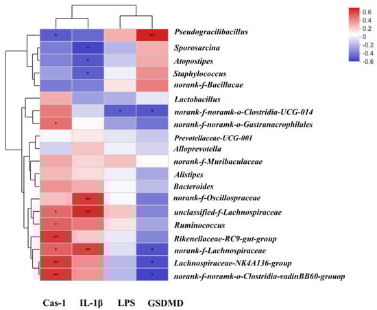 The Spearman’s correlation analysis among gut microbiota, LPS and the levels of Cas-1, GSDMD and IL-1β. * p < 0.05; ** p < 0.01.